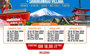 Setelah sampai di Jepang, kita akan disambut guide yang ramah, setelah itu anda akan langsung diajak untuk mengunjungi mengunjungi Shinsaibasi – Dotonburi yang merupakan daerah pusat perbelanjaan yang iconic dengan papan iklan glico mannya. Kemudian, kita akan mengjungi Fushimi Inari yang merupakan kuil Shinto dan juga kuil pusat bagi sekitar 40.000 kuil Inari yang memuliakan Inari. Terakhir kita akan mengunjingi Kiyomizu Temple yang merupakan kuil Budha kuno yang dibangun sejak tahun 798 dan mengalami 10 kali kerusakan akibat perang dan bencana alam. Kemudian kita akan melakukan perjalanan ke Gifu, Check-in hotel istirahat